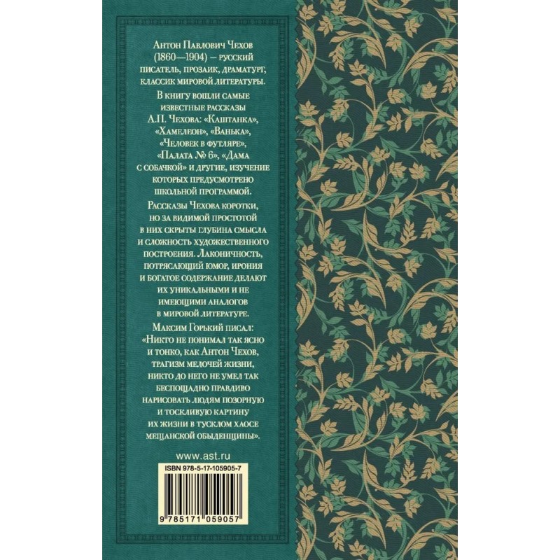 В книгу вошли самые известные рассказы А.П. Чехова: "Каштанка", "Хамелеон", "Ванька", "Человек в футляре", "Палата № 6", "Дама с собачкой" и другие, изучение которых предусмотрено школьной программой.