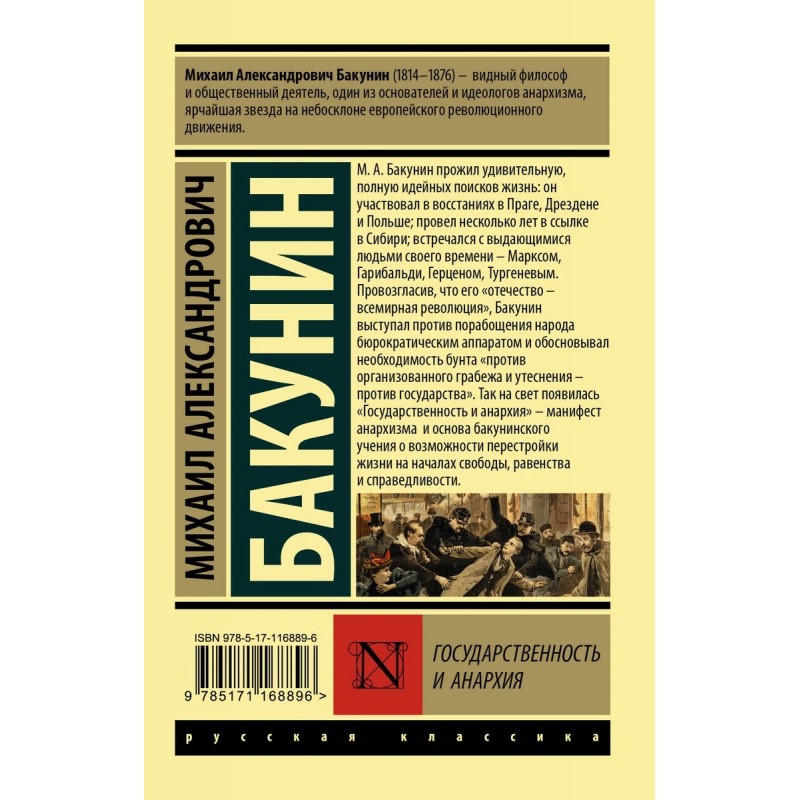 Михаил Александрович Бакунин (1814–1876) – видный философ и общественный деятель, один из основателей и идеологов анархизма, ярчайшая звезда на небосклоне европейского революционного движения. М. А. Бакунин прожил удивительную, полную идейных поисков жизнь: он участвовал в восстаниях в Праге, Дрездене и Польше; провел несколько лет в ссылке в Сибири; встречался с выдающимися людьми своего времени – Марксом, Гарибальди, Герценом, Тургеневым. Провозгласив, что его "отечество – всемирная революция", Бакунин выступал против порабощения народа бюрократическим аппаратом и обосновывал необходимость бунта "против организованного грабежа и утеснения – против государства". Так на свет появилась "Государственность и анархия" – манифест анархизма и основа бакунинского учения о возможности перестройки жизни на началах свободы, равенства и справедливости.