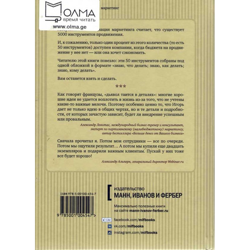 В этом очень практичном руководстве (ранее выпускавшемся ограниченным тиражом под названием "Без бюджета") вы найдете 50 эффективных маркетинговых инструментов, которые можно использовать в условиях ограниченного маркетингового бюджета (или его полного отсутствия). Самое ценное то, что по каждому инструменту приводится подробное описание - кому делать, что делать, как делать. Это незаменимое руководство для тех, кто желает использовать ресурсы компании максимально экономно и при этом с наибольшей отдачей.