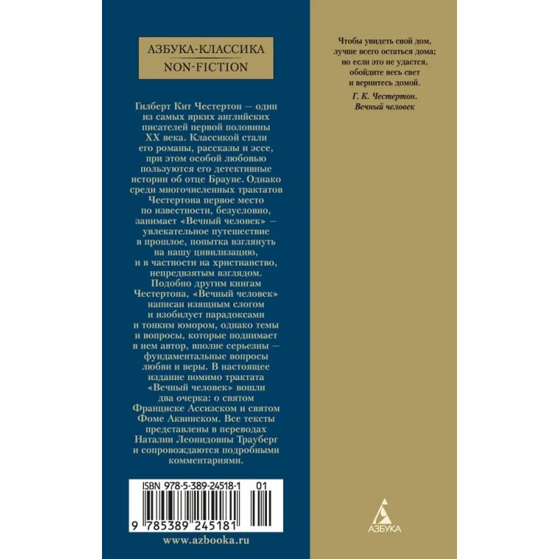 В настоящее издание помимо трактата "Вечный человек" вошли два очерка: о святом Франциске Ассизском и святом Фоме Аквинском. Все тексты представлены в переводах Наталии Леонидовны Трауберг и сопровождаются подробными комментариями.