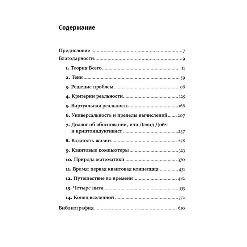Книга британского физика и философа Дэвида Дойча, одного из создателей концепции квантовых вычислений, наглядно демонстрирует, что эпоха великих философских систем вовсе не осталась в прошлом. Автор выстраивает целостный и согласующийся с научными знаниями ответ на один из самых фундаментальных философских вопросов: какова подлинная природа реальности.