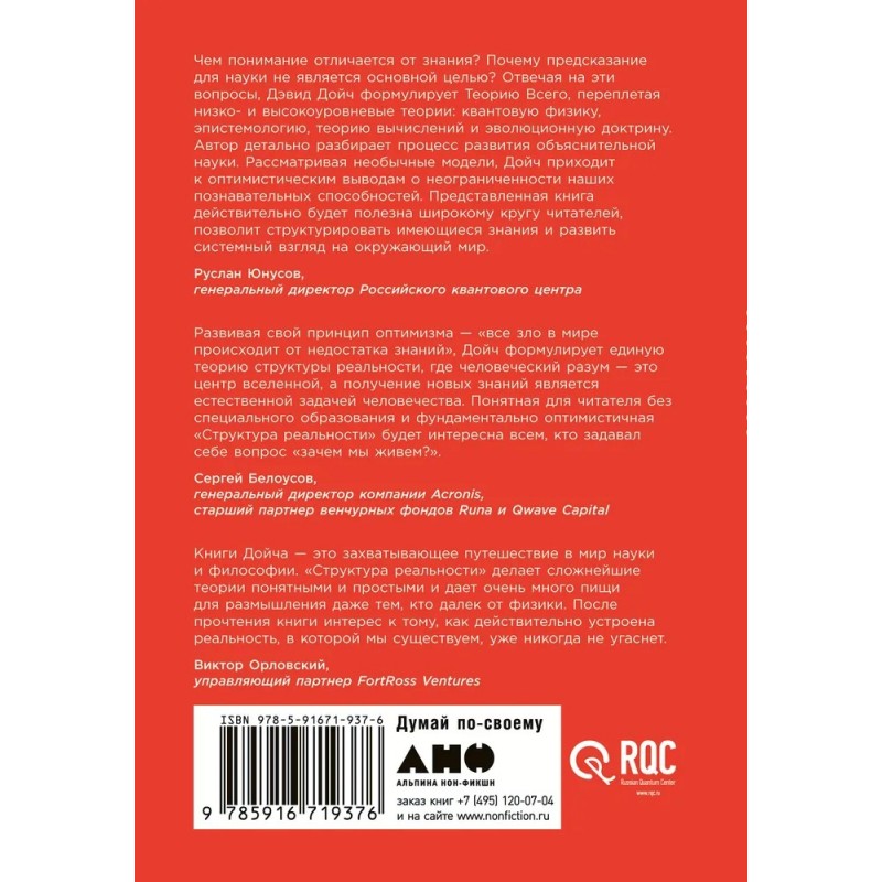 Вдумчивый читатель будет поражен сочетанием широты и логической последовательности мысли автора. С его разъяснениями мультиверс перестает казаться фантастикой и становится наиболее естественным описанием той поразительной реальности, которую открыла нам современная наука. За рамками книги остается вопрос о месте и роли человека в столь причудливом мире. Этой теме посвящена другая работа Дэвида Дойча - "Начало бесконечности", которая служит органичным продолжением "Структуры реальности".