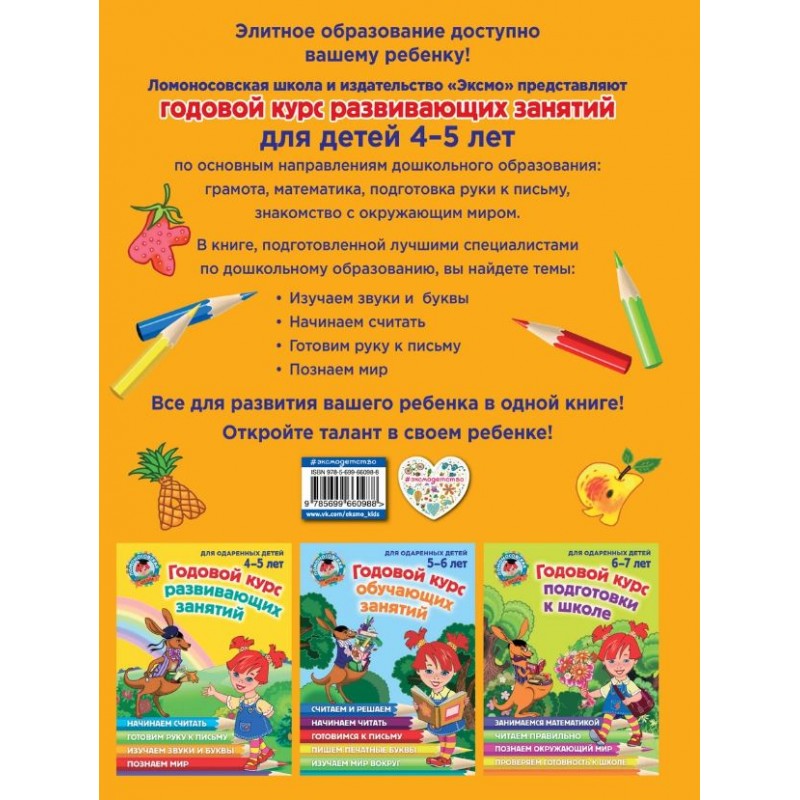 Книга включает в себя полный годовой курс развивающих занятий для детей 4-5 лет по основным направлениям дошкольного образования: грамота, математика, подготовка руки к письму, знакомство с окружающим миром, развитие речи, логики, внимания, воображения. Не нужно приобретать множество различных пособий, все, что нужно есть в этой книге. Задания расположены по мере усложнения и представлены в игровой форме. В книге учтены возрастные особенности дошкольников, что делает ее незаменимым помощником родителям и педагогам для занятий с ребенком.