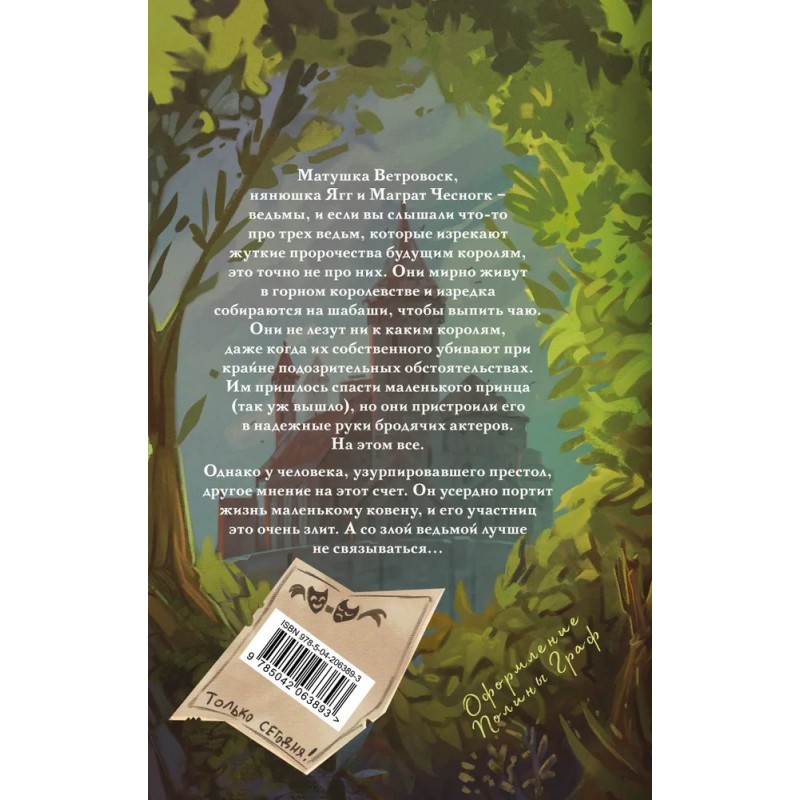 Матушка Ветровоск, нянюшка Ягг и Маграт Чесногк – ведьмы. Они мирно живут в горном королевстве, изредка собираются на шабаши, чтобы выпить чаю, и думать не думают пророчествовать (хотя нянюшка рада похохотать над хорошей шуткой). Они не лезут ни к каким королям, даже когда их собственного убивают при крайне подозрительных обстоятельствах. Им пришлось спасти маленького принца (так уж вышло), но они пристроили его в надёжные руки бродячих актёров. На этом всё.