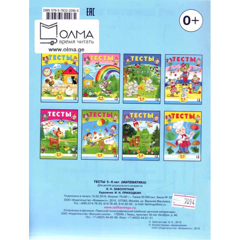 Книга тестов поможет Вам определить уровень развития математических способностей и мелкой моторики ребёнка 5-6 лет.