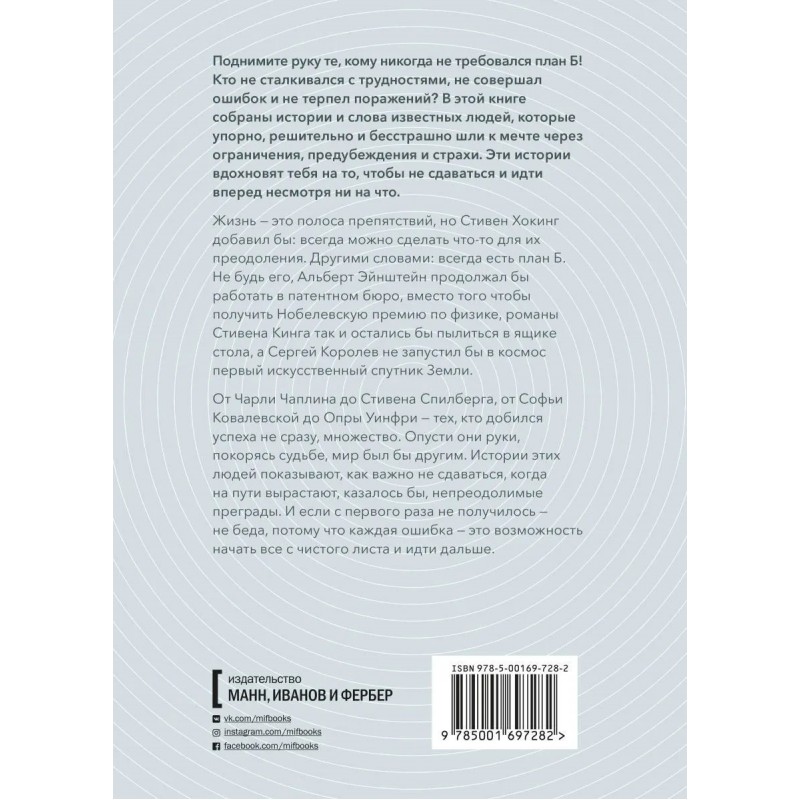 Кому из нас не требовался план Б? Кто не оказывался в низшей точке, растеряв веру в свои силы? Уинстон Черчилль утверждал, что успех — это способность переходить от одной неудачи к другой, не теряя энтузиазма. Большинство признанных гениев не раз сталкивались с отказами и неудачами. Более того: без фиаско невозможно движение и обучение.