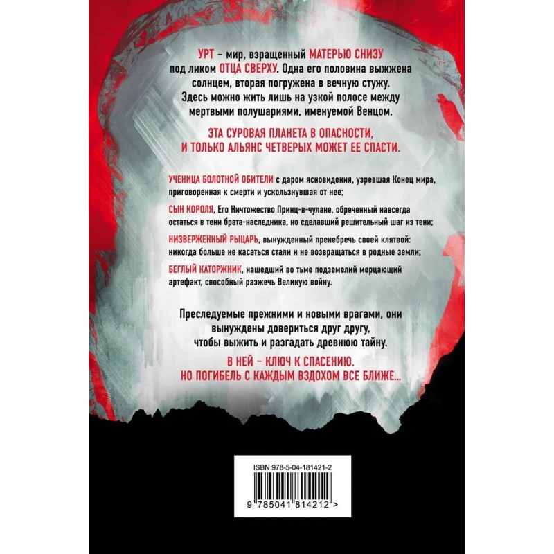 Пророчество возгласило, что ей суждено уничтожить мир... Урт – мир, взращенный Матерью Снизу под ликом Отца Сверху. Одна его половина выжжена солнцем, вторая погружена в вечную стужу. Здесь можно жить лишь на узкой полосе между мертвыми полушариями, именуемой Венцом. Эта суровая планета в опасности, и только альянс четверых может ее спасти. Ученица болотной Обители с даром ясновидения, узревшая Конец мира, приговоренная к смерти и ускользнувшая от нее; сын короля, Его Ничтожество Принц-в-чулане, обреченный навсегда остаться в тени брата-наследника, но сделавший решительный шаг из тени; низверженный рыцарь, вынужденный пренебречь своей клятвой: никогда больше не касаться стали и не возвращаться в родные земли; беглый каторжник, нашедший во тьме подземелий мерцающий артефакт, способный разжечь Великую войну.
