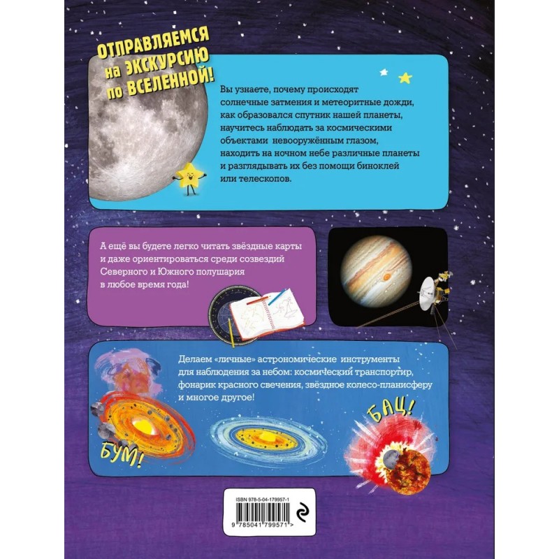 Читатели узнают, как образовались разные небесные тела, в чём секрет природных явлений, наблюдаемых в небе, как находить невооружённым глазом различные созвездия и планеты и многое другое. Карты небесных полушарий и сделанные своими руками астрономические инструменты помогут каждому мастерски ориентироваться в самых загадочных уголках звёздного неба! А разглядеть объекты Солнечной системе во всей их красе позволят большие и яркие фотографии.