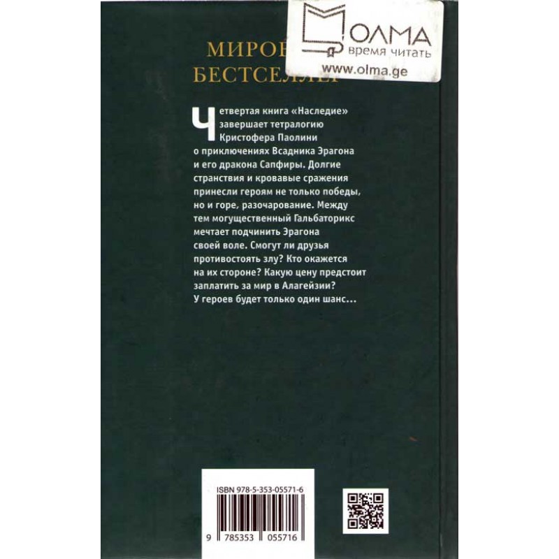 Еще недавно Всадник драконов Эрагон был бедным деревенским мальчиком, а его дракон Сапфира синим камнем, затерянным в лесу, а теперь от них зависит судьба всего мира. Долгие месяцы странствий и сражений принесли героям победу и надежду, хотя и разбили их сердца. Но настоящая битва ждет их впереди. Эрагону и Сапфире предстоит сразиться с могущественным Гальбаториксом. Хватит ли у них сил для решающей битвы? Кто знает, смогут ли они свергнуть жестокого короля и восстановить справедливость в Алагейзии? А если и смогут, то какой ценой? У них будет только один шанс… Завораживающее завершение тетралогии К. Паолини «Наследие», ставшей мировым бестселлером.