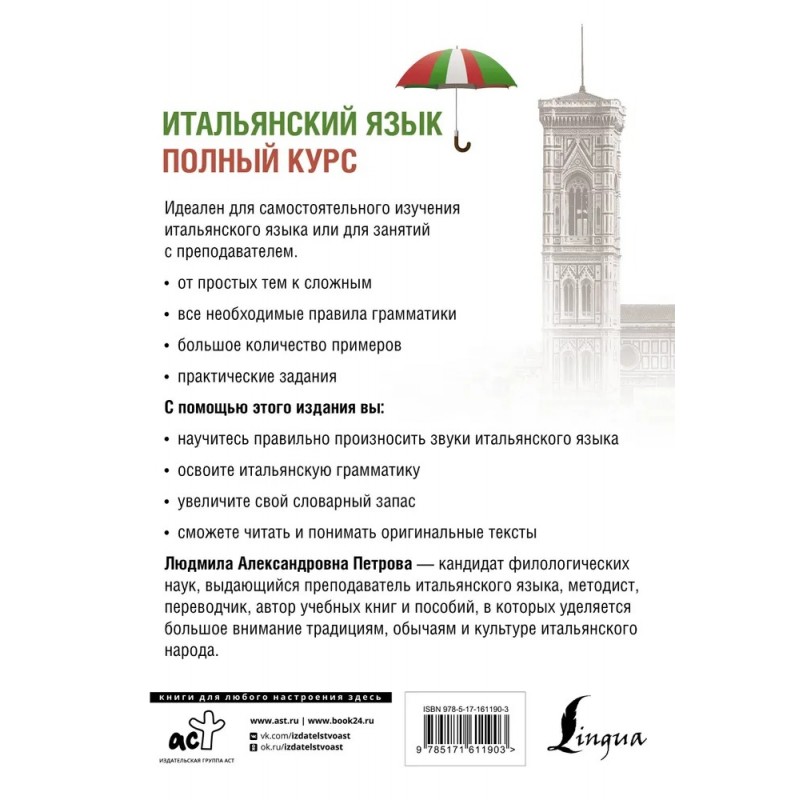 Людмила Александровна Петрова – кандидат филологических наук, выдающийся преподаватель итальянского языка, методист, переводчик, автор учебных книг и пособий, в которых уделяется большое внимание традициям, обычаям и культуре итальянского народа. Полный курс содержит 26 уроков, постепенное изучение которых позволяет освоить правила произношения и чтения, изучить основы грамматики, познакомиться с богатым лексическим материалом. Теория представлена в простой и понятной форме, а разнообразные упражнения на все виды речевой деятельности помогают закрепить полученные знания. Любопытные факты об Италии и итальянцах расширяют кругозор и делают обучение еще интереснее. Начните говорить и читать по-итальянски с пособием от авторитетного автора! Издание идеально подходит для всех, кто начинает и продолжает изучать итальянский язык.