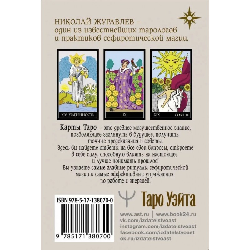 Комплект состоит из 78 карт Таро Райдера Уэйта и руководство по работе с картами с подробным описанием Старших и Младших Арканов, самыми эффективными и действенными раскладами. Николай Журавлев — один из известнейших тарологов и практиков сефиротической магии. Карты Таро — это древнее могущественное знание, позволяющее заглянуть в таинственный мир магии и безграничных возможностей, получить точные предсказания и советы. Благодаря этой колоде вы обретете силу, способную влиять на настоящее и предсказывать будущее!