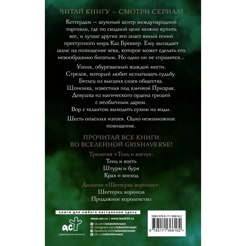 «Шестерка воронов» – спин-офф трилогии бестселлеров Бардуго о необычных, «модифицированных» людях – гришах. Действие книги разворачивается в трущобах столицы государства Керчия Кеттердама, портового города, где царит беззаконие, а выживает хитрейший. Всем здесь заправляют местные банды с колоритными названиями: «Черные пики», «Обломщики», «Отбросы». Именно последние, действующие под охраной эмблемы гордой птицы, – и есть шестерка воронов. И именно им, этим циникам и изгоям, предстоит почти невыполнимая миссия: выкрасть из неприступной тюрьмы ученого, создавшего наркотик, способный в десятки раз увеличить силу гриша. Возможен ли хэппи-энд в этой мрачной, натуралистичной истории? Кажется, что вряд ли.