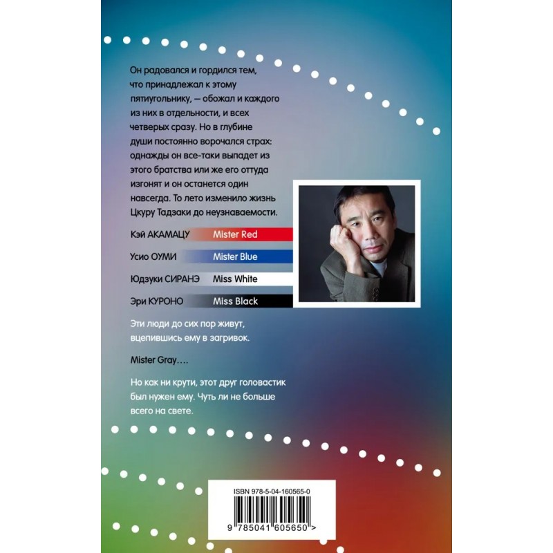 К каким последствиям приводят разрушительные эмоции, связанные с предательством? Может ли любовь победить одиночество? Неужели возможно стать другим человеком как снаружи, так и внутри? Могут ли скрытые эмоции оставаться скрытыми? Отпустят ли потрясения прошлого главного героя Цкуру Тадзаки в новое счастливое будущее? Все непросто и очень-очень интересно, как всегда у Харуки Мураками. Погружаешься молниеносно, и не освободиться, пока не дочитаешь до конца!