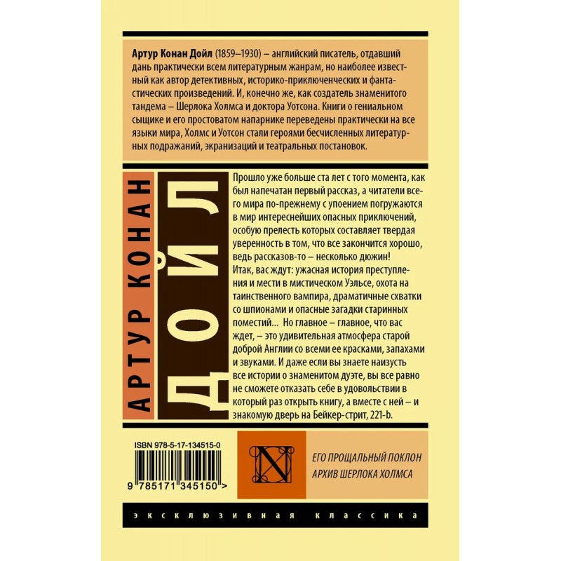 Итак, вас ждут: ужасная история преступления и мести в мистическом Уэльсе, охота на таинственного вампира, драматичные схватки со шпионами и опасные загадки старинных поместий... Но главное – главное, что вас ждет, – это удивительная атмосфера старой доброй Англии со всеми ее красками, запахами и звуками. И даже если вы знаете наизусть все истории о знаменитом дуэте, вы все равно не сможете отказать себе в удовольствии в который раз открыть книгу, а вместе с ней – и знакомую дверь на Бейкер-стрит, 221-b.