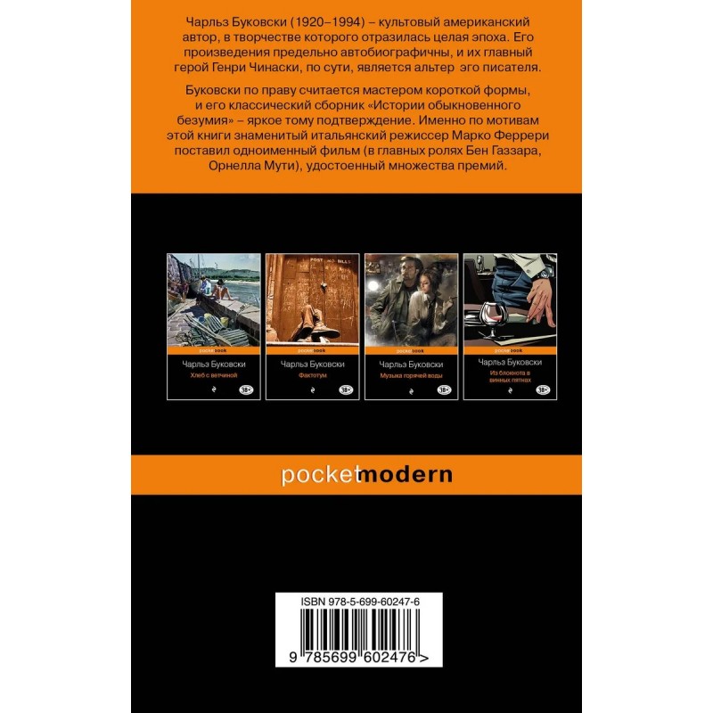 Буковски по праву считается мастером короткой формы, и его классический сборник «Истории обыкновенного безумия» — яркое тому подтверждение: доводя свое фирменное владение словом до невероятного совершенства, Буковски проводит своего лирического героя — бабника и пьяницу, явное альтер эго автора, — по всем кругам современного ада. Именно по мотивам этой книги знаменитый итальянский режиссер Марко Феррери поставил одноименный фильм (в главных ролях Бен Газзара, Орнелла Мути), удостоенный премий ФИПРЕССИ на кинофестивале в Сан-Себастьяне и премий «Давид ди Донателло» сразу в нескольких категориях.