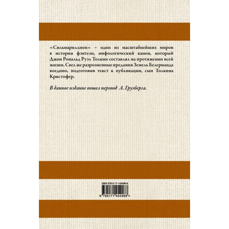 "Сильмариллион" – один из масштабнейших миров в истории фэнтези, мифологический канон, который Джон Руэл Толкин составлял на протяжении всей жизни. Свел же разрозненные предания Земель Белерианда воедино, подготовив текст к публикации, сын Толкина Кристофер. В данное издание вошел перевод А.Грузберга.