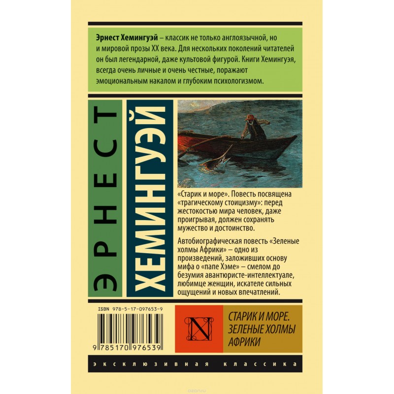 «Старик и море». Повесть посвящена «трагическому стоицизму»: перед жестокостью мира человек, даже проигрывая, должен сохранять мужество и достоинство. Автобиографическая повесть «Зеленые холмы Африки» - одно из произведений, заложивших основу мифа о «папе Хэме» - смелом до безумия авантюристе-интеллектуале, любимце женщин, искателе сильных ощущений и новых впечатлений. Новый перевод.