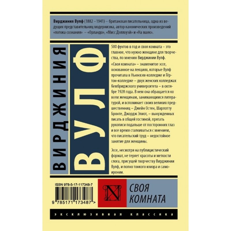500 фунтов в год и своя комната – это главное, что нужно женщине для творчества, по мнению Вирджинии Вулф. "Своя комната" – знаменитое эссе, основанное на лекциях, которые Вулф прочитала в Ньюнхэм-колледже и Гёртон-колледже – двух женских колледжах Кембриджского университета – в октябре 1928 года. В нем она обращается ко всем женщинам, занимающимся литературой, и вспоминает своих великих предшественниц – Джейн Остен, Шарлотту Бронте, Джордж Элиот, – вынужденных писать в общей гостиной, прятать рукописи подальше от посторонних глаз и все время сталкиваться с мнением, что писательский труд – недостойное занятие для женщины. Эссе, несмотря на публицистический формат, не теряет красоты и меткости слога, присущей творчеству Вирджинии Вулф, и полно тонкого юмора и самоиронии.
