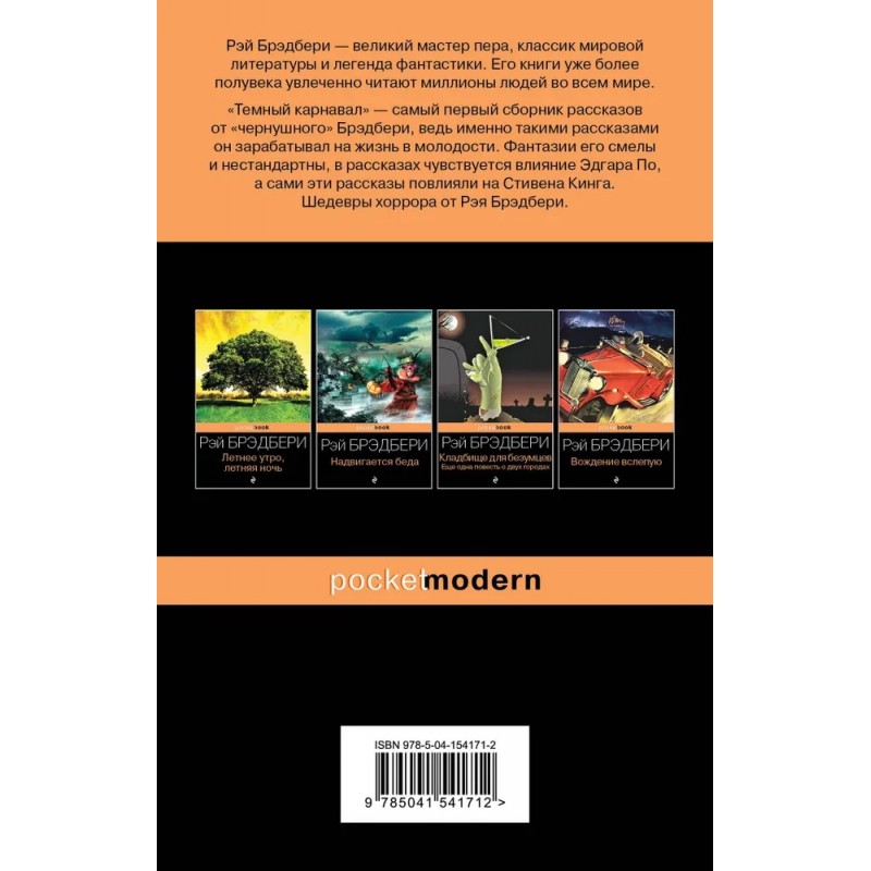 Настоящая книга поистине уникальна — это самый первый сборник Брэдбери, с тех пор фактически не переиздававшийся, не доступный больше нигде в мире и ни на каком языке вот уже 60 лет! Отдельные рассказы из «Темного карнавала» (в том числе такие классические, как «Странница» и «Крошка-убийца», «Коса» и «Дядюшка Эйнар») перерабатывались и включались в более поздние сборники, однако переиздавать свой дебют в исходном виде Брэдбери категорически отказывался.