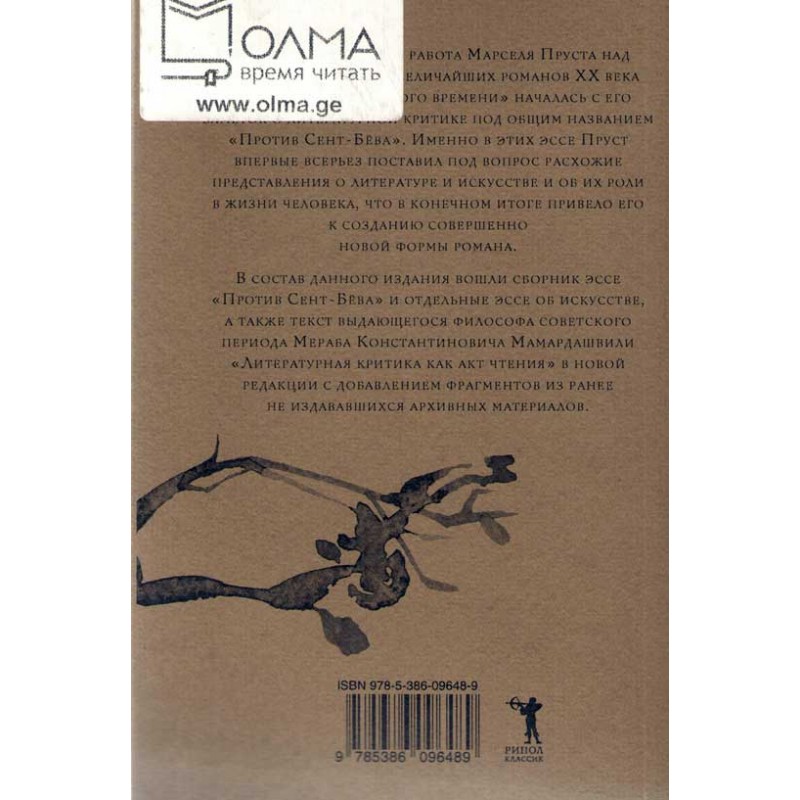 В состав данного издания вошли сборник эссе "Против Сент-Бёва" и отдельные эссе об искусстве, а также текст выдающегося философа советского периода Мераба Константиновича Мамардашвили "Литературная критика как акт чтения" в новой редакции с добавлением фрагментов из ранее не издававшихся архивных материалов.
