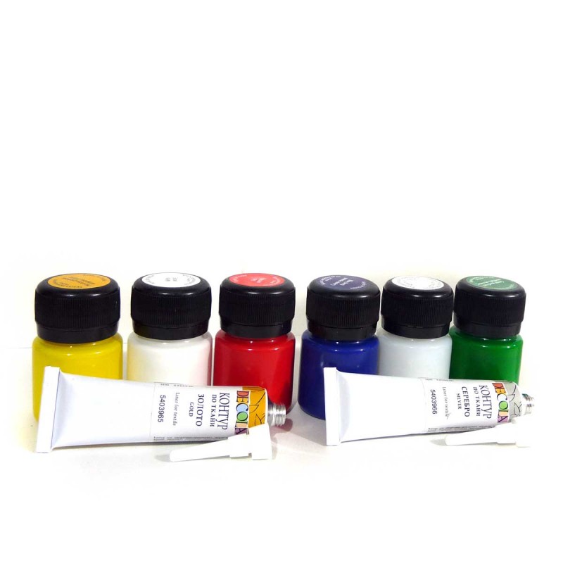 входят 5 баночек с акриловой краской по 20 мл., 2 тубы с контуром