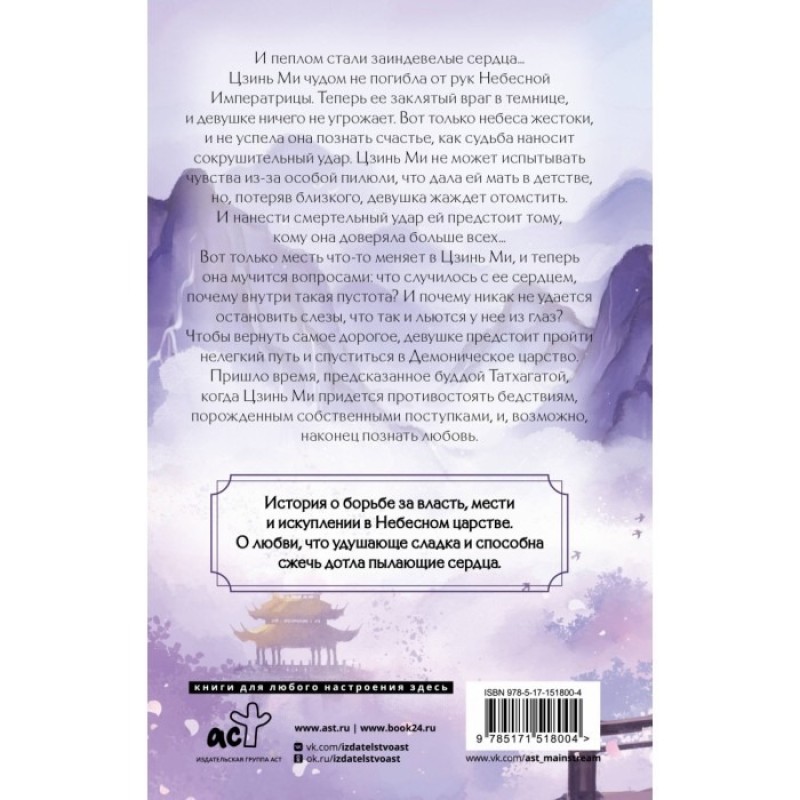 Из-за пилюли, которую мать дала ей в детстве, Цзинь Ми не может испытывать чувства. Но это не спасает ее от предательства того, кем она дорожила больше всех. Цзинь Ми в безопасности, ее заклятый враг в темнице, и все же слезы ручьем льются из ее глаз. Ее сжигает жажда мести, и погасить этот костер можно лишь в дьявольском пламени. Следуя предсказанию будды Татхагаты и ища искупления, девушка спускается в Демоническое царство…