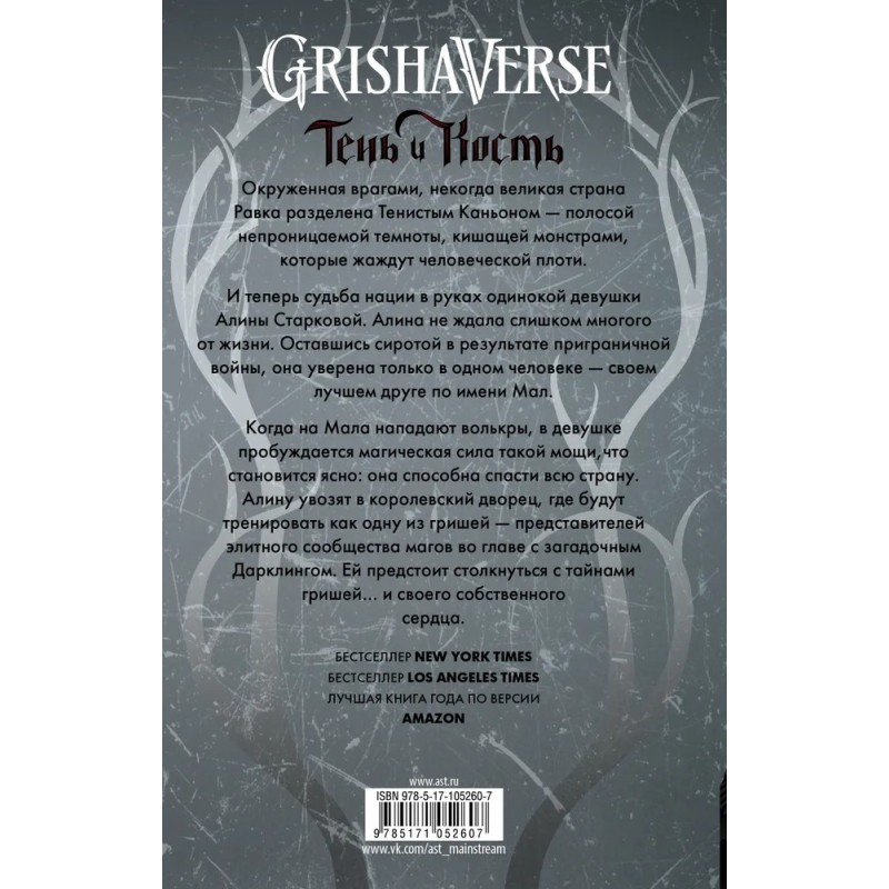 «Тень и кость» - дебютный роман Ли Бардуго, автора бестселлеров «Шестерка воронов» и «Продажное королевство». Книга, с которой началась история гришéй - людей с магическими способностями. Алина Старкова - семнадцатилетняя девушка-сирота, которую отправили на войну в приграничную зону. Она знает, что, возможно, не переживет свой первый бой. Но дороже жизни ей Мал - ее единственный друг, которого она боится потерять. Когда на них нападают волькры - монстры, враждебные порождения тьмы, - Алина неожиданно открывает в себе силу, о которой не подозревала. Магия Алины так сильна, что становится ясно: она способна спасти всю страну. Алину увозят в королевский дворец, где будут тренировать как одну из гришей - представителей элитного сообщества магов во главе с загадочным Дарклингом. Ей предстоит столкнуться с тайнами гришей… и своего собственного сердца. Книга вошла в список бестселлеров New York Times и Los Angeles Times; права на ее экранизацию приобрел продюсер Дэвид Хейман - человек, благодаря которому увидели свет фильмы о Гарри Поттере. Роман был переведен на 22 языка. Впервые на русском!