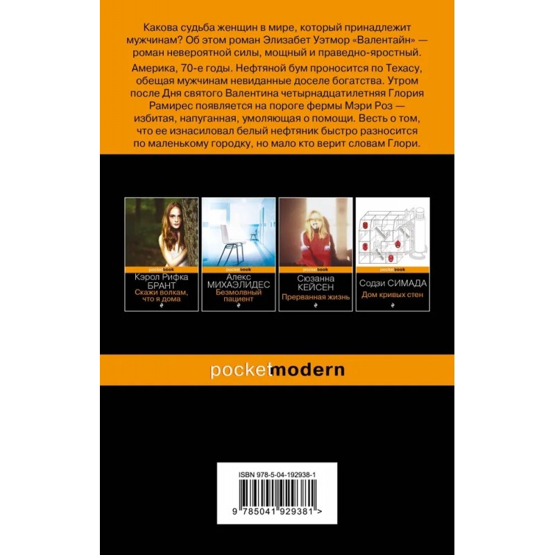 «Мне не верится, что Элизабет Уэтмор начинающая писательница. Как у нее получилось ворваться на сцену с такой мощью и мастерством? "Валентайн" блестящий, острый, напряженный и разрушительный. Уэтмор вырвала жестокий, грандиозный Западный Техас из рук мужчин и передала слово девочкам и женщинам, тем, кто всегда страдал, выживал и все равно оставлял свой след в этом враждебном мире. Эти невероятно живые и незабываемые женские персонажи навсегда останутся со мной». — Элизабет Гилберт