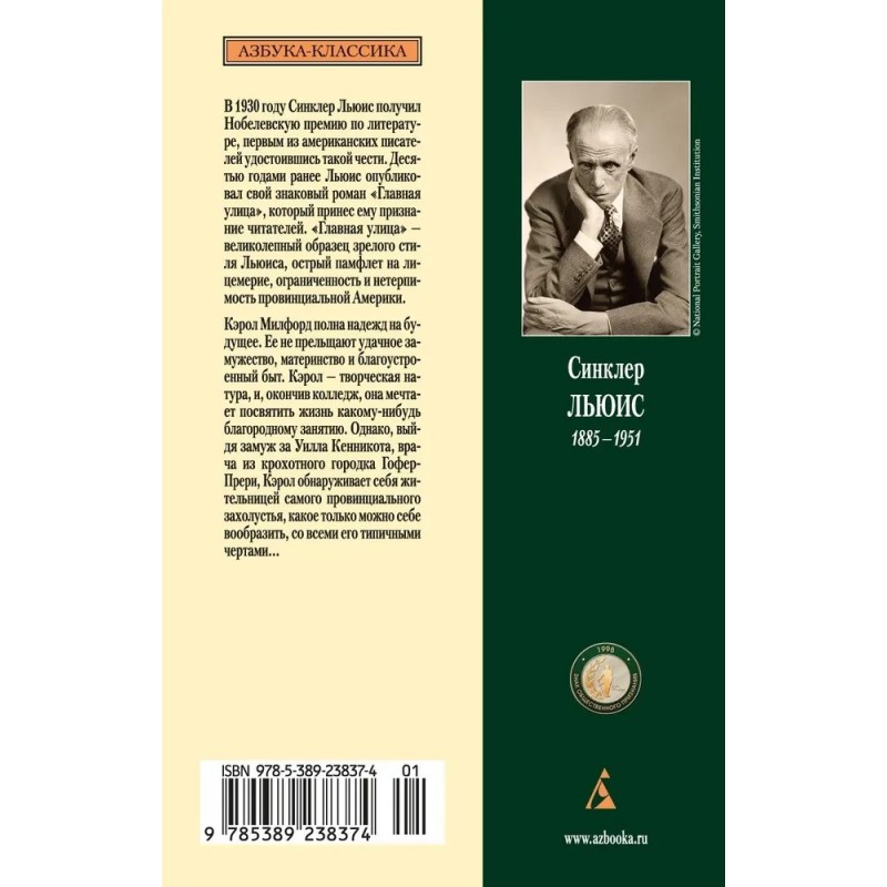 В 1930 году Синклер Льюис (1885–1951) получил Нобелевскую премию по литературе, первым из американских писателей удостоившись такой чести. Десятью годами ранее Льюис опубликовал свой знаковый роман «Главная улица», который принес ему признание читателей. «Главная улица» — великолепный образец зрелого стиля Льюиса, острый памфлет на лицемерие, ограниченность и нетерпимость провинциальной Америки. Кэрол Милфорд полна надежд на будущее. Ее не прельщают удачное замужество, материнство и благоустроенный быт. Кэрол — творческая натура, и, окончив колледж, она мечтает посвятить жизнь какому-нибудь благородному занятию. Однако, выйдя замуж за Уилла Кенникота, врача из крохотного городка Гофер-Прери, Кэрол обнаруживает себя жительницей самого провинциального захолустья, какое только можно себе вообразить, со всеми его типичными чертами…