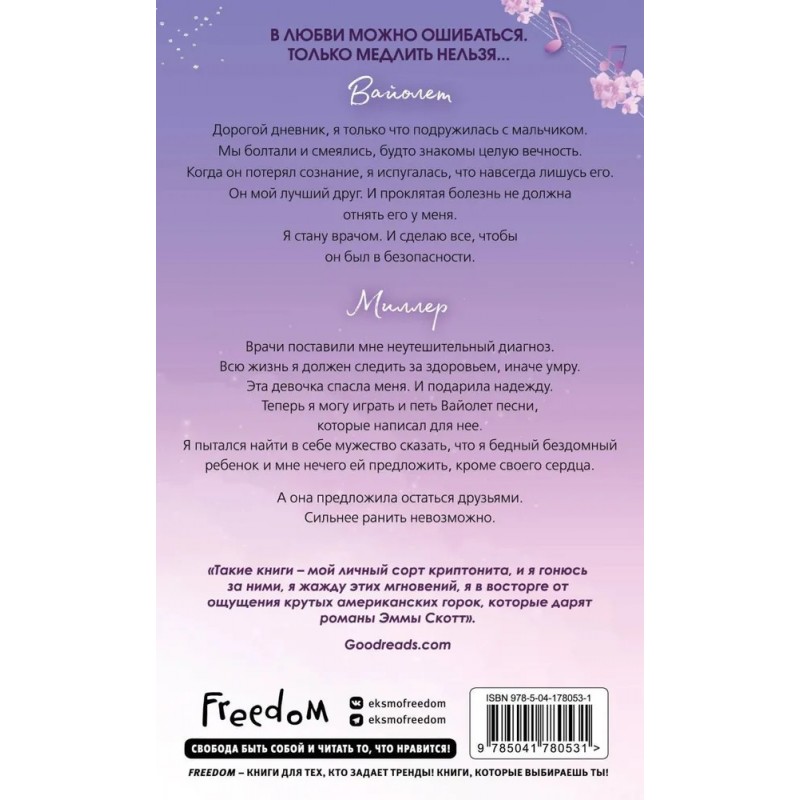 ВАЙОЛЕТ Дорогой дневник, я только что подружилась с мальчиком. Мы болтали и смеялись, будто знакомы целую вечность. Когда он потерял сознание, я испугалась, что навсегда потеряю его. Он мой лучший друг. И проклятая болезнь не должна отнять его у меня. Я стану врачом. И сделаю все, чтобы он был в безопасности. МИЛЛЕР Врачи поставили мне неутешительный диагноз. Всю жизнь я должен следить за здоровьем, иначе умру. Эта девочка спасла меня. И подарила надежду. Теперь я могу играть и петь Вайолет песни, которы