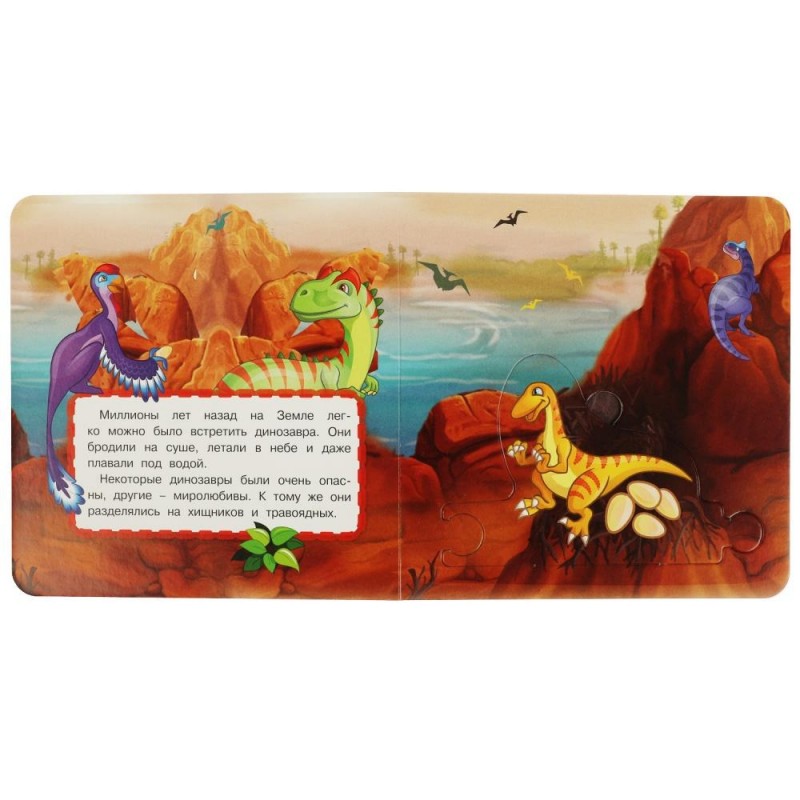 Данная книга выполняет сразу 2 функции: это и книга для чтения, и игра в пазлы. На каждом развороте малыша ждёт яркий пазл с изображением милых динозавриков и интересное повествование. Книжка изготовлена из плотного картона, поэтому мамы могут не опасаться, что ребёнок порвёт странички. Благодаря удобному формату книгу можно взять с собой в дорогу.