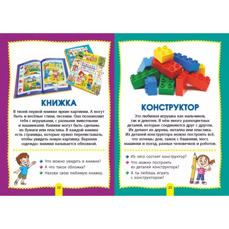 "Уважаемые родители! Предлагаем вам развивающую серию для вашего ребёнка, которая познакомит малыша с окружающим миром, а яркие фотографии и реалистичные картинки помогут ему в этом. Кроме того, в игровой форме "вопрос-ответ" вы сможете закрепить у ребёнка полученные знания. В книге "Первые слова" дети смогут познакомиться со значением многих предметов, окружающих их дома и на улице, одежды и игрушек, произнося их названия как первые слова, например, что такое стул или качели, шапка или сапоги, бутылочка или вилка, паровозик или кукла."