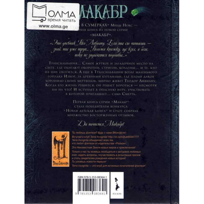 Первая книга новой фэнтези-серии от победителя VII сезона литературного конкурса "Новая детская книга" Милы Нокс. Трансильвания... Самое жуткое и загадочное место на свете, где обитают оборотни, стригои, колдуны... и те, кто на них охотится. А еще в Трансильвании возле маленького городка Извор, за древними курганами, где племя даков хоронило своих мертвецов, мирно живет Теодор Ливиану.