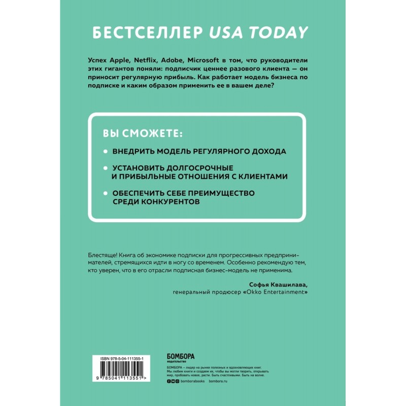 «Блестяще! Книга об экономике подписки для прогрессивных предпринимателей, стремящихся идти в ногу со временем. Особенно рекомендую тем, кто уверен, что в его отрасли подписная бизнес-модель не применима». — Софья Квашилава, Генеральный продюсер Okko Entertainment
