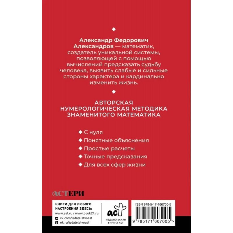 Перед вами самоучитель по нумерологии от знаменитого математика, основателя нумерологической школы, легендарного учителя А. Ф. Александрова, в новом, удобном формате! Книгу удобно носить с собой, чтобы изучать и пользоваться, где бы вы ни находились, даже в дороге. Книги А. Ф. Александрова много лет пользуются большой популярностью среди нумерологов-профессионалов. Но эта книга особенная. Она создана специально для тех, кто хочет изучить нумерологию "с нуля", разобраться, как тайное знание о числах может изменить жизнь. В книге собрано все, что необходимо знать новичку, а расчеты сопровождаются подробными и понятными объяснениями автора. Они просты для восприятия и шаг за шагом научат видеть важные закономерности, которые оказывают колоссальное влияние на жизнь. Вы сможете определить числовой код имени, научиться составлять психологический портрет личности, выявить сильные и слабые стороны, найти правильный жизненный путь, раскрыть свое истинное предназначение. Школа нумерологической системы А. Александрова имеет множество учеников и последователей даже после ухода ее основателя из жизни. Высокие рейтинги, множество пятизвездных отзывов говорят о том, что система А. Ф. Александрова — важный, а иногда и вовсе незаменимый инструмент в преобразовании жизни. Эта книга станет отличным руководством для тех, кто всегда хотел стать сведущим в этой сфере и активно применять полученные знания на практике.
