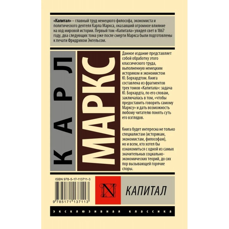 "Капитал" — главный труд немецкого философа, экономиста и политического деятеля Карла Маркса, оказавший огромное влияние на ход мировой истории. Первый том "Капитала" увидел свет в 1867 году, два следующих тома уже после смерти Маркса были подготовлены к печати Фридрихом Энгельсом. Данное издание представляет собой обработку этого классического труда, выполненную немецким историком и экономистом Ю. Борхардтом. Книга составлена из фрагментов трех томов "Капитала": задача Ю. Борхардта, по его словам, заключалась в том, "чтобы предоставить говорить самому Марксу" и дать возможность любому читателю понять суть его взглядов. Книга будет интересна не только специалистам (историкам, экономистам, философам), но и всем, кто хотел бы ознакомиться с одной из самых значительных социально-экономических теорий, до сих пор вызывающей горячие споры.