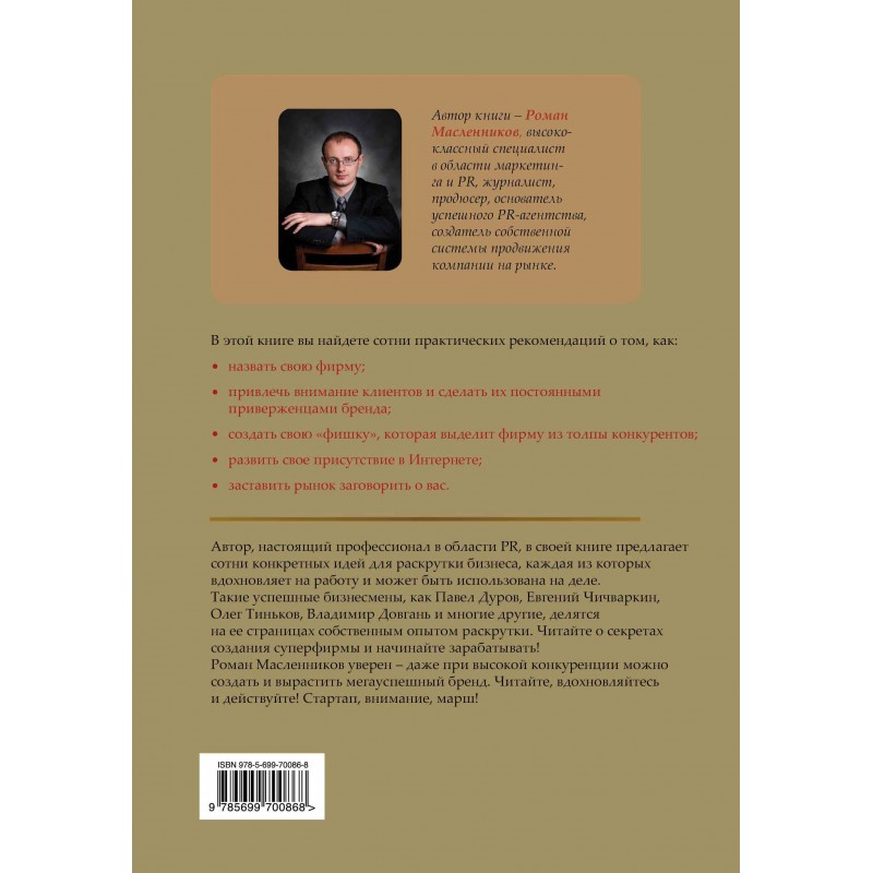В новой книге Роман Масленников предлагает изучить три метода продвижения бренда: рекламу, маркетинг и пиар. Последнему способу он уделяет самое пристальное внимание, ведь он уверен: "Пиар-способы раскрутки - это самые дешевые на свете способы продвижения бренда".