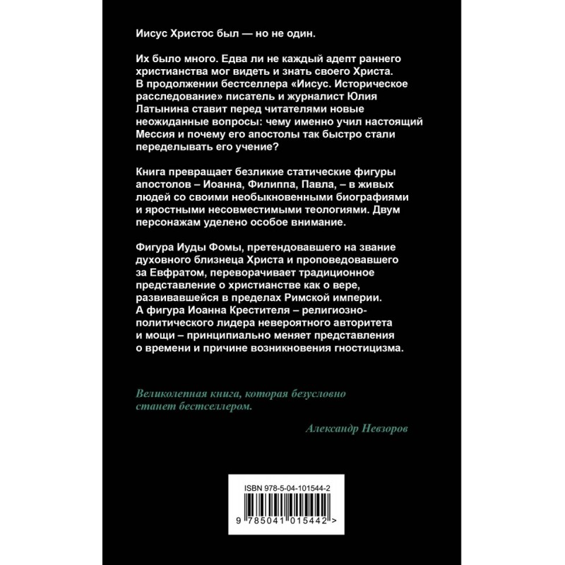 Юлия Латынина продолжает вести свое историческое расследование, на этот раз реконструируя личности ближайших соратников Иисуса Христа. Книга превращает безликие статические фигуры апостолов — Иоанна, Филиппа, Павла — в живых людей, со своими необыкновенными биографиями и яростными несовместимыми теологиями. Фигура Иуды Фомы, претендовавшего на звание духовного близнеца Христа и проповедовавшего за Евфратом, переворачивает традиционное представление о христианстве как о вере, развивавшейся в пределах Римской империи. А фигура Иоанна Крестителя — религиозно-политического лидера невероятного авторитета и мощи — принципиально меняет представления о времени и причине возникновения гностицизма.