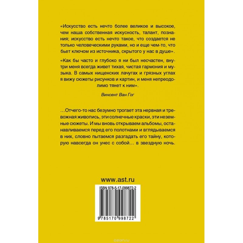 - Маленький, удобный формат: можно взять в дорогу, помещается в дамскую сумочку- Великолепные иллюстрации- Собрание шедевров с примечаниями- Идеальный подарокВинсент Ван Гог - личность поистине легендарная. Пожалуй, ни об одном художнике мира не было написано такого количества исследовательских работ; ни один факт из его жизни не был оставлен без внимания и много раз подробно анализировался, вызвав, тем не менее, огромное количество кривотолков. Ни одна личная жизнь была настолько всесторонне изучена, что даже послужила сюжетом для монографий и романов, а отношения с братом Тео легли в основу известного фильма. Медики до сих пор спорят о том, чем же все-таки болел Ван Гог, и как это повлияло на его творчество? Художники, представители разных течений и направлений, борются за право выбора Ван Гога своим учителем и гуру, в то время как он, самоучка, не был представителем ни одной из известных школ. Благодаря множеству книг, например, "Жизнь Ван Гога" Анри Перрюшо или "Жажда жизни" Ирвинга Стоуна, некоторые факты его биографии, такие, как история с отрезанным ухом, превратились в своеобразные легенды. Кажется, что мы должны знать о нем все. Но вновь и вновь открываются новые факты, появляются новые свидетельства, опровергающие предыдущие теории…и мы понимаем, что он так и останется в наших умах вечной загадкой. Спорить и говорить можно бесконечно, постоянно задаваясь вопросом: "почему мы снова и снова хотим знать о нем больше, отчего нас так трогает эта нервная и тревожная живопись, эти солнечные краски, эти порой неземные сюжеты? Вот уж поистине можно поверить Морису Вламинку, сказавшему как-то: "Я люблю Ван Гога, больше чем своего отца". И мы вновь открываем альбомы, идем в музеи, останавливаемся перед его полотнами и вглядываемся в них, словно пытаемся разгадать его тайну, которую навсегда он унес с собой… к звездам.