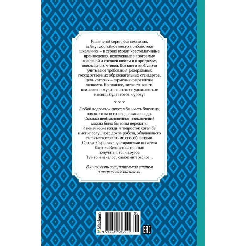 Любой подросток захотел бы иметь близнеца, похожего на него как две капли воды. Сколько необыкновенных приключений можно было бы тогда пережить! И конечно же каждый подросток хотел бы иметь послушного друга-робота, обладающего сверхъестественными способностями. Сереже Сыроежкину стараниями писателя Евгения Велтистова повезло получить и то, и другое. Тут-то и началось самое интересное…