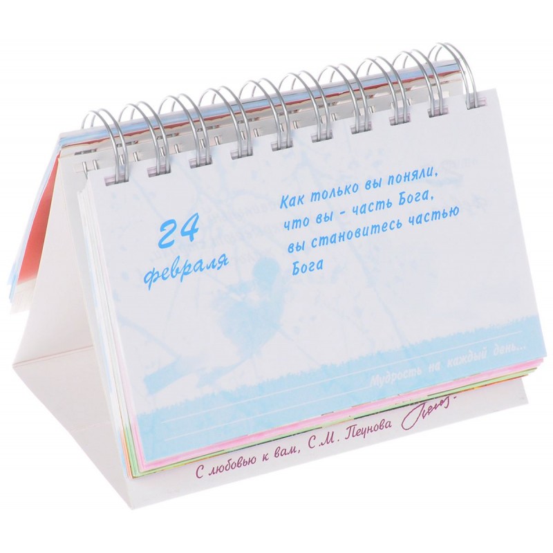 Этот календарь - ваш искренний друг и советчик, который в любой момент времени подскажет вам выход из сложившейся ситуации и подарит золотой ключик от самой заветной дверцы в вашей жизни. В каждом высказывании содержится глубокий смысл, задумываясь над которым в течение дня, мы становимся чуть-чуть мудрее. В этом календаре не указаны дни недели, а это значит, что важно смысловое содержание дня. Им можно пользоваться всю жизнь.