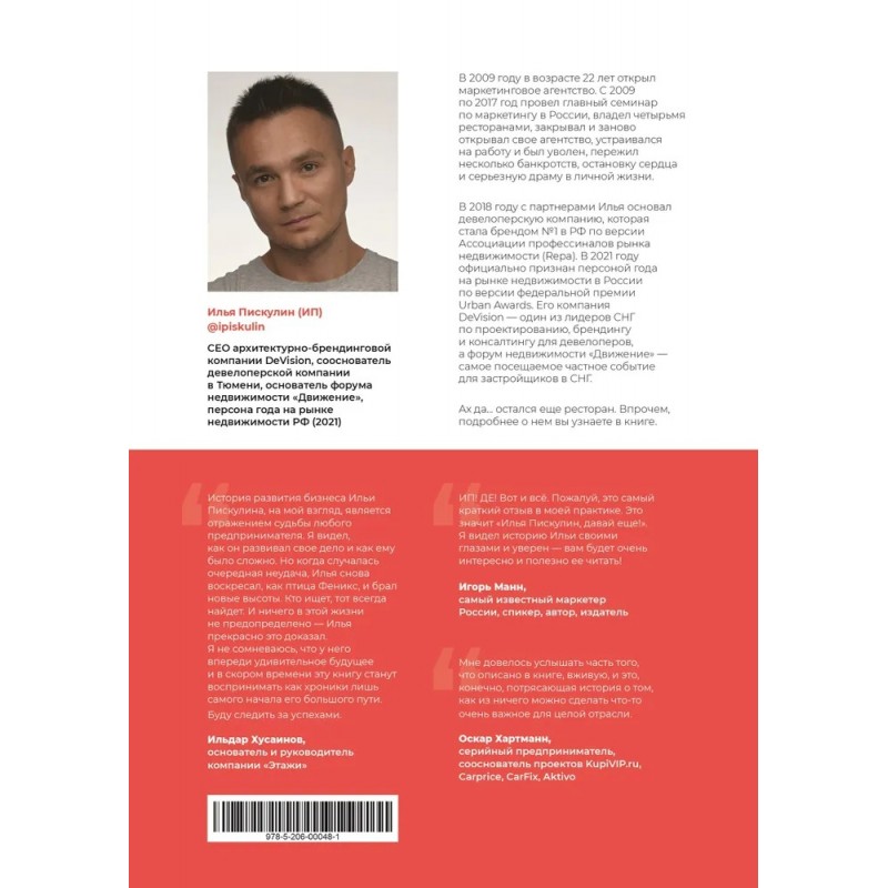 Илья Пискулин — один из самых интересных серийных российских бизнесменов. Он прошел путь от открытия маркетингового агентства Love marketing в Тюмени и нескольких ресторанов до создания уникальной девелоперской компании DeVision, которая занимается архитектурой и брендингом по всей стране. Свой сложный одиннадцатилетний опыт бизнесмен искренне и в деталях описал в автобиографической книге: автор делится, как сам пишет, «некрасивой правдой» — своими переживаниями, ошибками, недостатками, эмоциями. Это реальная (и порой суровая) личная история предпринимателя, которая будет полезна начинающим лидерам.