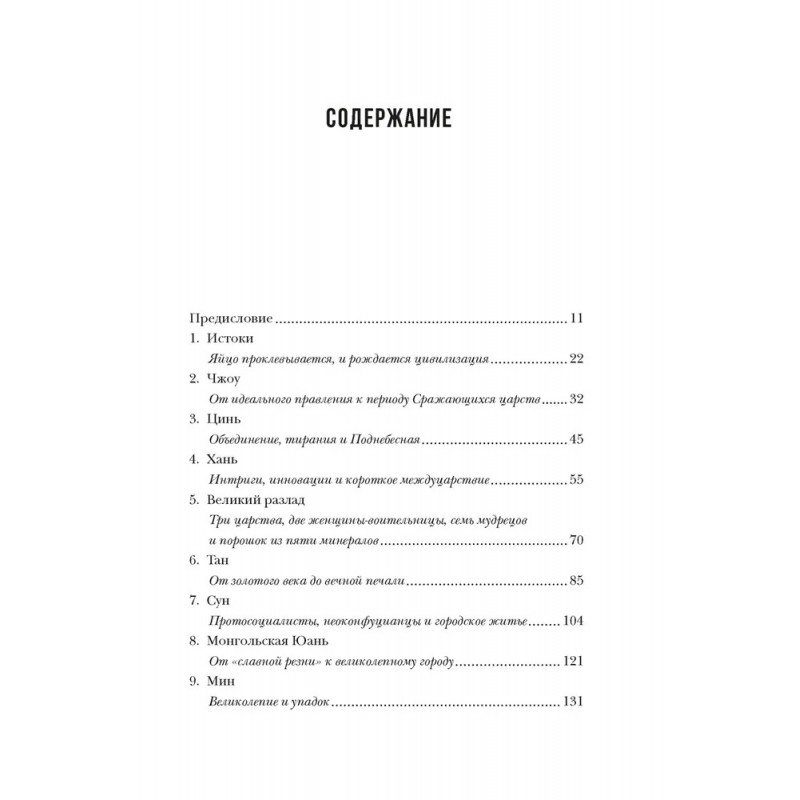 «Столкнувшись с необходимостью выбирать между ключевыми фигурами, экономическими и социальными процессами, военной историей, эстетическими и интеллектуальными течениями, я выбираю... всё. Я выделяю темы, события и личностей, которые, как мне кажется, проливают свет на суть своего времени, на развитие китайской цивилизации и государственности. Я не упоминаю всех многочисленных императоров, мятежников, мыслителей, художников, чудаков, изобретателей, политиков и поэтов. Я познакомлю вас с некоторыми из самых интересных и влиятельных людей и, насколько это возможно в такой небольшой книге, позволю им самим рассказать о себе. Я приведу цитаты из работ древних историков, современных политиков, поэтов и сатириков. Китай очень многообразен, и это сложное многообразие — часть его величия». (Линда Джейвин)