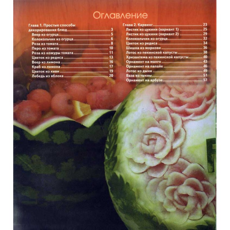 Здесь вы увидите, как сделать и применить простые элементы, которые придадут изящество повседневному блюду, а также сложные - выполненные с помощью техник резьбы по овощам и фруктам - карвинга.