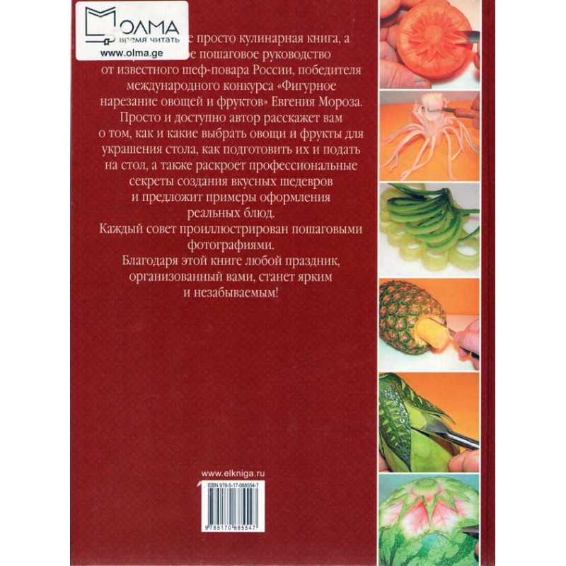 В данной книге Евгений Мороз расскажет, как из авокадо сделать экзотический цветок, из моркови – букет роз или золотую рыбку, а огурец превратить в виноградную лозу. Каждый рецепт сопровождается пошаговыми иллюстрациями и подробными комментариями.