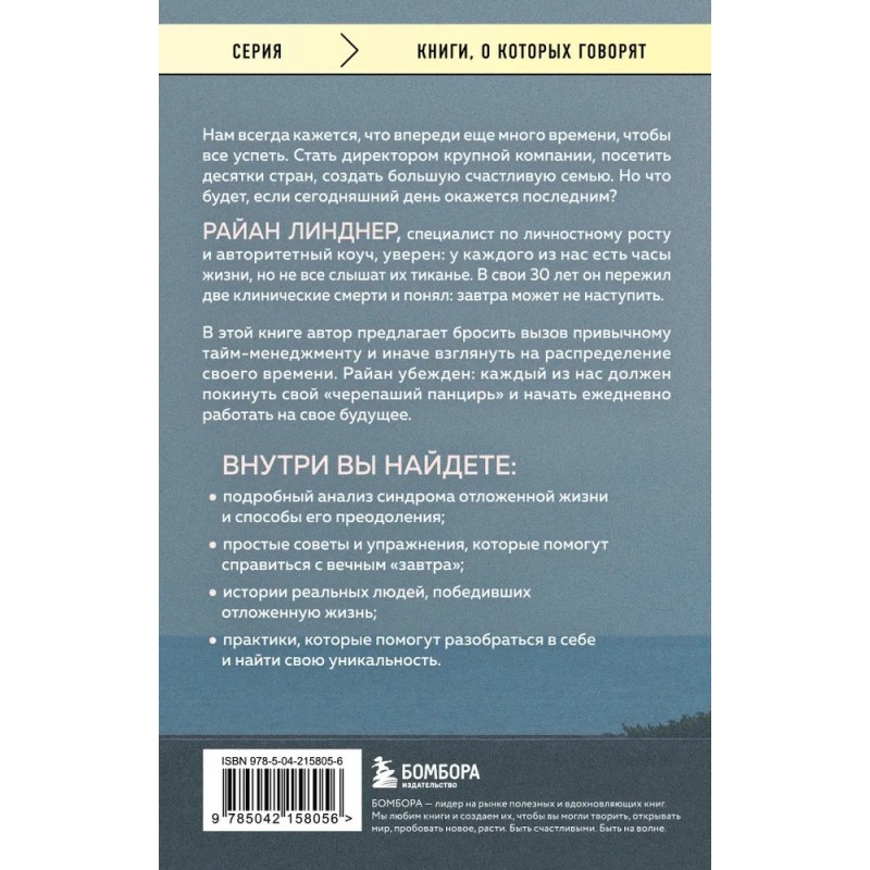 В этой книге автор предлагает бросить вызов привычному тайм-менеджменту и иначе взглянуть на распределение своего времени. Райан убежден — каждый из нас должен покинуть свой «черепаший панцирь» и начать ежедневно работать на свое будущее.