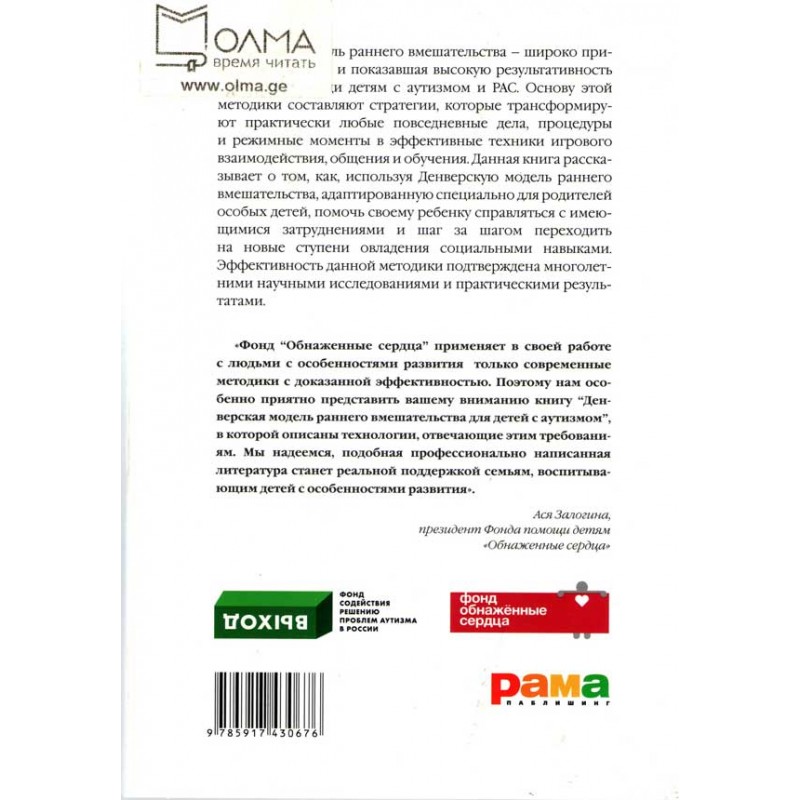 Денверская модель раннего вмешательства - широко применяемая в мире и показавшая высокую результативность методика помощи детям с аутизмом и РАС. Основу этой методики составляют стратегии, которые трансформируют практически любые повседневные дела, процедуры и режимные моменты в эффективные техники игрового взаимодействия, общения и обучения. Данная книга рассказывает о том, как, используя Денверскую модель раннего вмешательства, адаптированную специально для родителей особых детей, помочь своему ребенку справляться с имеющимися затруднениями и шаг за шагом переходить на новые ступени овладения социальными навыками. Эффективность данной методики подтверждена многолетними научными исследованиями и практическими результатами.