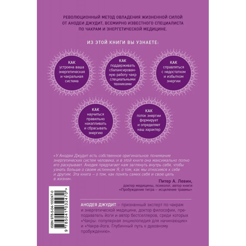 «У Анодеи Джудит есть собственное оригинальное понимание энергетических систем человека, и в этой книге она максимально полно его раскрывает. Анодея предлагает нам заглянуть внутрь себя, чтобы узнать больше о своем истинном Я, о том, как мы относимся к себе и другим. Эта книга — о том, как понять самих себя и свою цель в жизни». — Питер А. Левин, доктор медицины, психолог, автор книги «Пробуждение тигра — исцеление травмы»