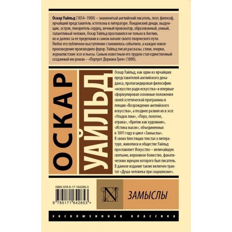 От автора бестселлера «Портрет Дориана Грея». Создатель знаменитого «Портрета Дориана Грея» Оскар Уайльд пропагандировал философию эстетизма, искусства ради искусства. Лучше всего принципы своего мировоззрения он сформулировал в вышедшем в 1891 году сборнике «Замыслы», состоящем из четырех эссе. Согласно мировоззрению Уайльда, искусство должно существовать исключительно ради искусства, жизнь имитирует искусства куда больше, чем искусство — жизнь, а истинная цель любого писателя и художника — лгать, рассказывать прекрасные и неправдивые вещи.