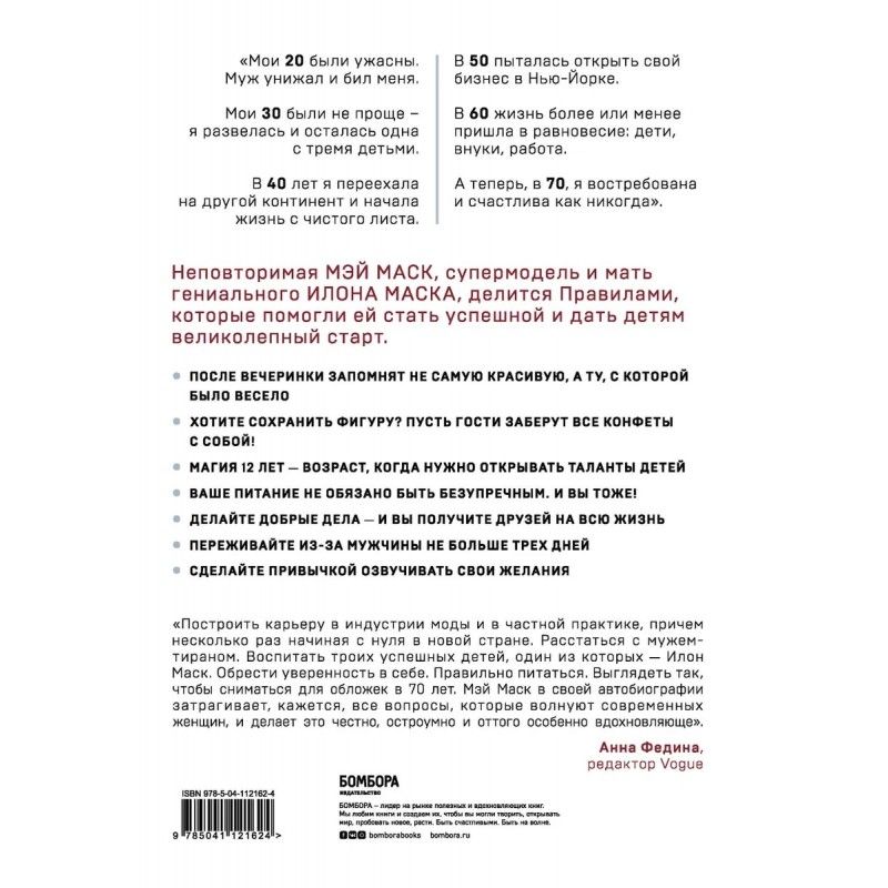 В своей первой книге Маск не только рассказывает историю своей богатой приключениями жизни, но и с удовольствием дает множество полезных советов о том, как сохранить здоровье и красоту, быть стильной и уверенной, оставаться хорошей матерью и при этом строить карьеру, а главное – принимать себя, не бояться пробовать новое и любить жизнь в любом возрасте.